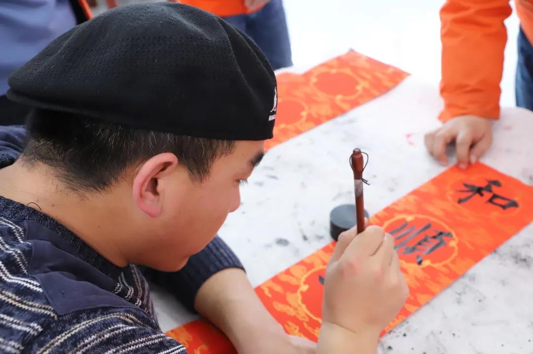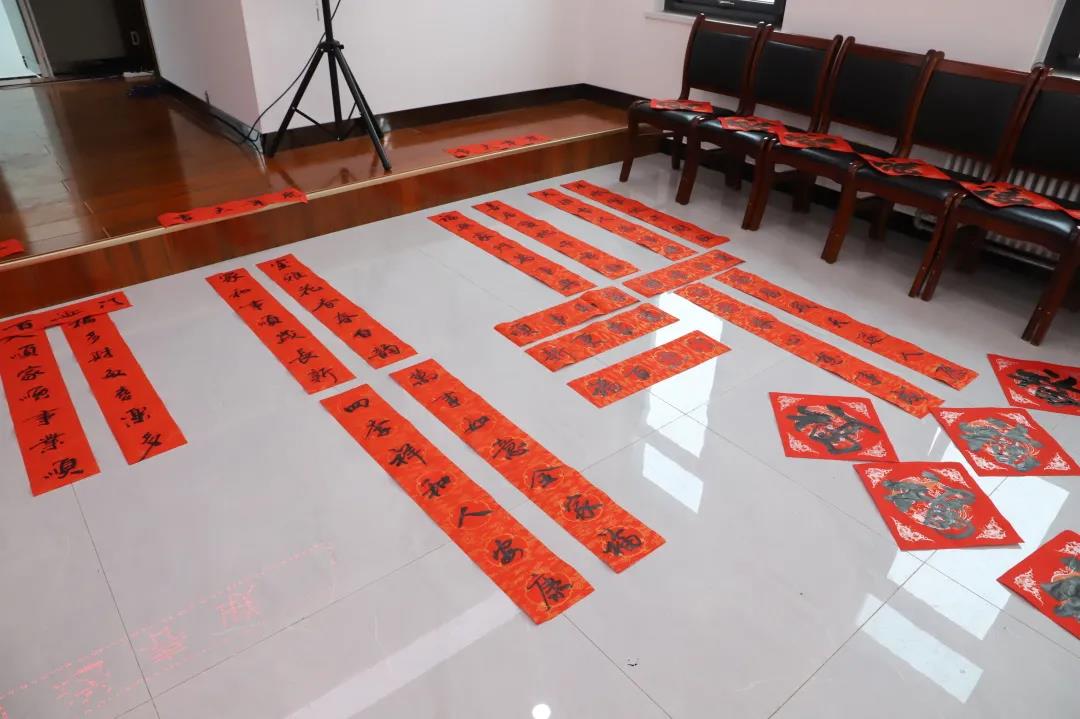 筆走龍蛇間,一張張筆酣墨飽、寓意吉祥的“?!弊?、春聯(lián)躍然紙上。集團(tuán)各單位書法愛好者和員工們?cè)缭鐏淼綍鴮懍F(xiàn)場(chǎng),一邊幫著鋪紙調(diào)墨,一邊井然有序地向書法家們“求”取自己中意的春聯(lián)和美好祝福。兩個(gè)多小時(shí),書法家們共寫出了200余幅作品,并現(xiàn)場(chǎng)講解釋義、互動(dòng)交流,活動(dòng)現(xiàn)場(chǎng)鋪滿了春聯(lián)和福字,形成了一片熱鬧非凡的紅色海洋。