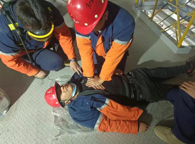 本次演練模擬化工熱電公司35T2#鍋爐床溫?zé)犭娕急淮擦蠜_刷時,檢修工作人員進(jìn)入爐膛檢查熱電偶測量端時,發(fā)生爐膛窒息事故,導(dǎo)致檢修人員昏迷倒地,情況十分危急。事故發(fā)生后,化工熱電公司立即啟動應(yīng)急預(yù)案,在總指揮的調(diào)度下,現(xiàn)場搶險組攜帶測氧儀并戴好正壓式氧氣呼吸器,對檢修窒息人員組織搶救,將其抬出爐膛并進(jìn)行心肺復(fù)蘇和人工呼吸,使窒息人員逐漸恢復(fù)呼吸與心跳。整個演練歷時1小時。