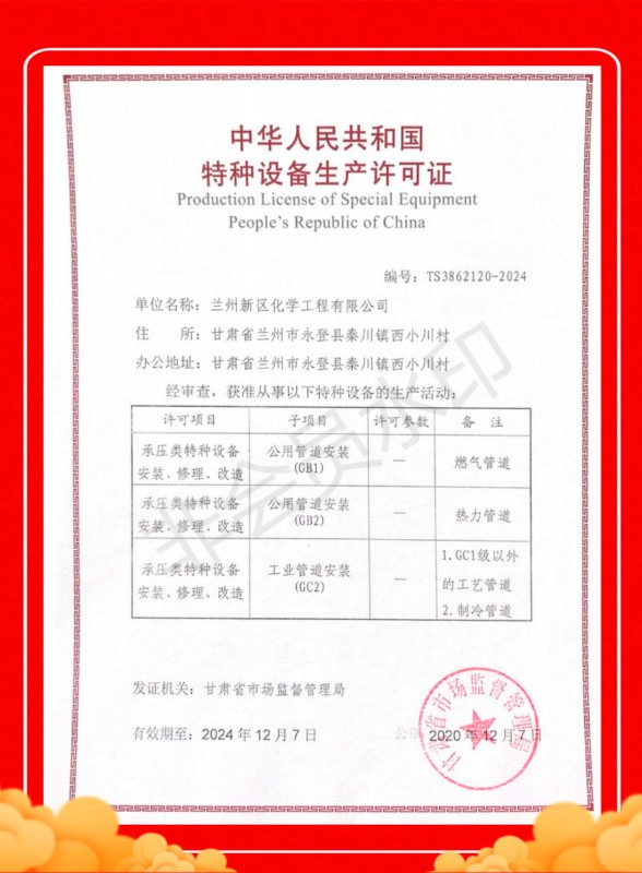 2020年12月7日,石投集團(tuán)化學(xué)工程公司順利取得了由甘肅省市場(chǎng)監(jiān)督管理局批準(zhǔn)的《特種設(shè)備壓力管道安裝許可證》,該許可證是新區(qū)首個(gè)壓力管道安裝許可證。