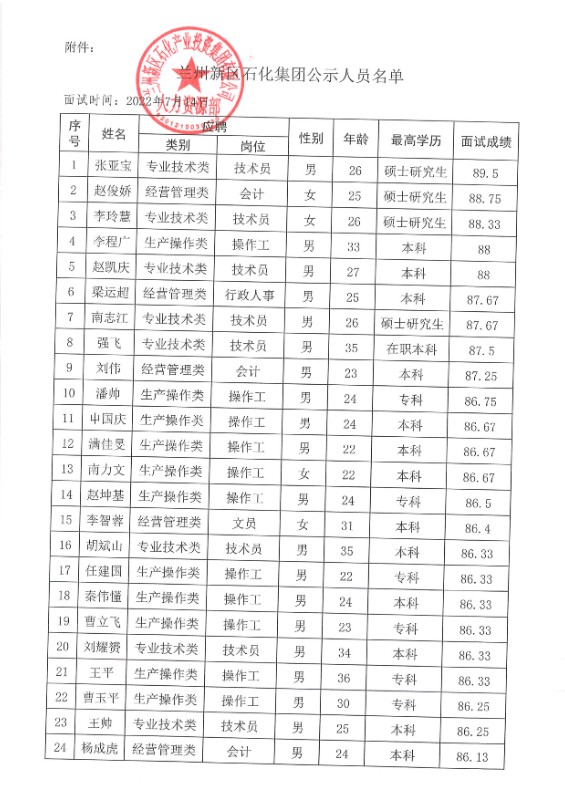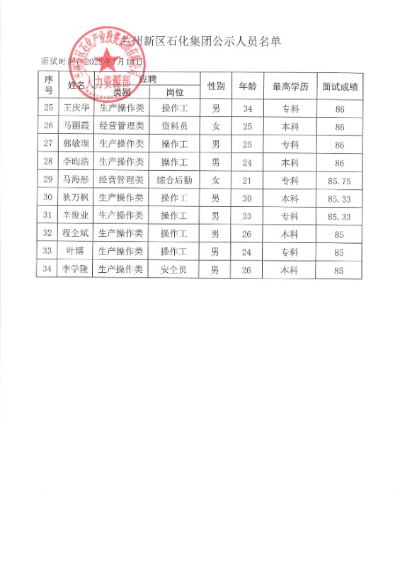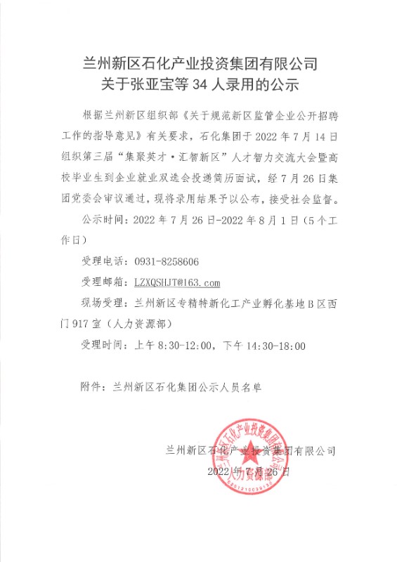 蘭州新區(qū)石化產(chǎn)業(yè)投資集團有限公司關(guān)于張亞寶等34人錄用的公示