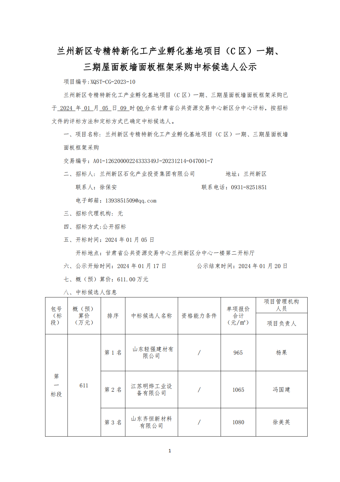 蘭州新區(qū)專精特新化工產(chǎn)業(yè)孵化基地項(xiàng)目(C 區(qū))一期、 三期屋面板墻面板框架采購中標(biāo)候選人公示