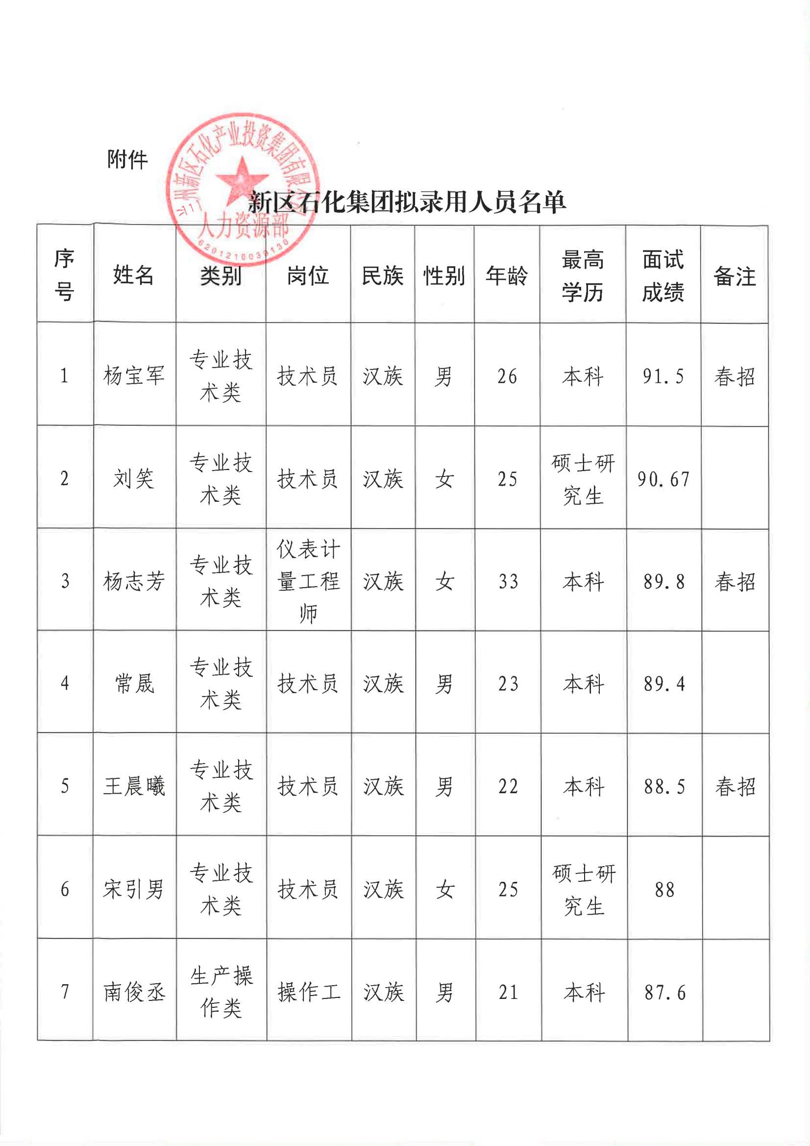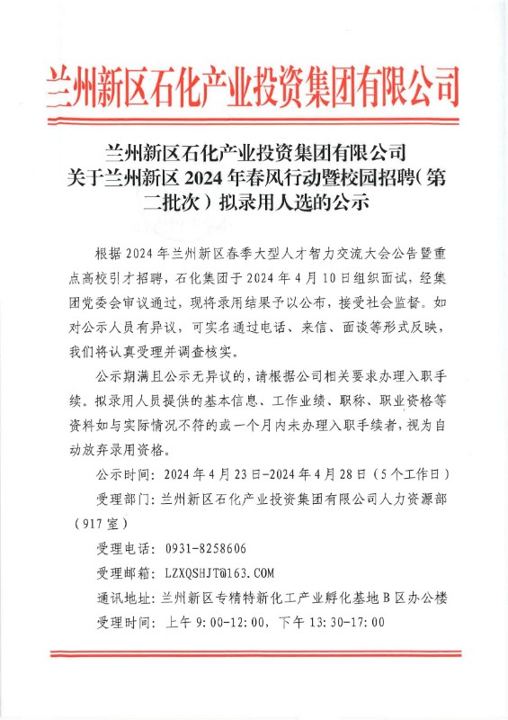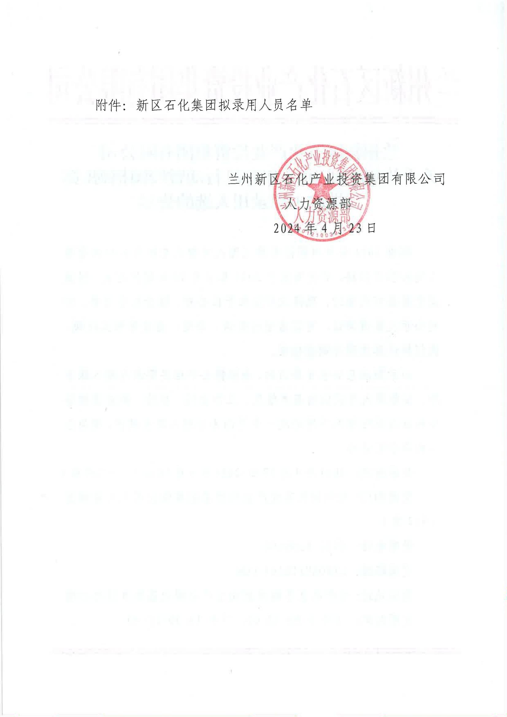 蘭州新區(qū)石化產業(yè)投資集團有限公司 關于蘭州新區(qū)2024年春風行動暨校園招聘(第二批次)擬錄用人選的公示