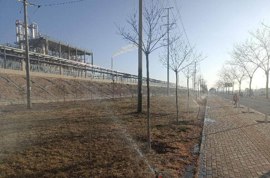 冬灌采用水車澆灌、人工澆灌、噴灌等多種形式確保水分充分滲透到土壤中。同時(shí),加大巡查力度,采取實(shí)地抽樣檢查冬灌滲水深度,對澆灌不徹底和過度灌溉的綠地要求立即進(jìn)行整改,確保每塊綠地澆灌徹底,使苗木吸收到充足水分,對新栽植的苗木結(jié)合封凍水在樹木根部培起土堆加強(qiáng)其保溫、保濕效果,目前冬灌正在有序進(jìn)行中。